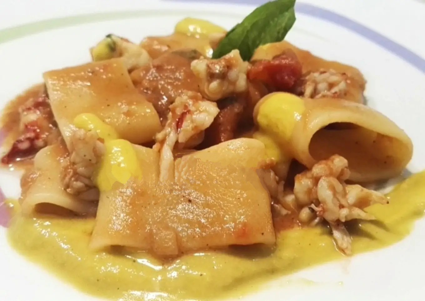 Paccheri con Scampi sfumati al Cognac e Pesto di Fiori di Zucchine